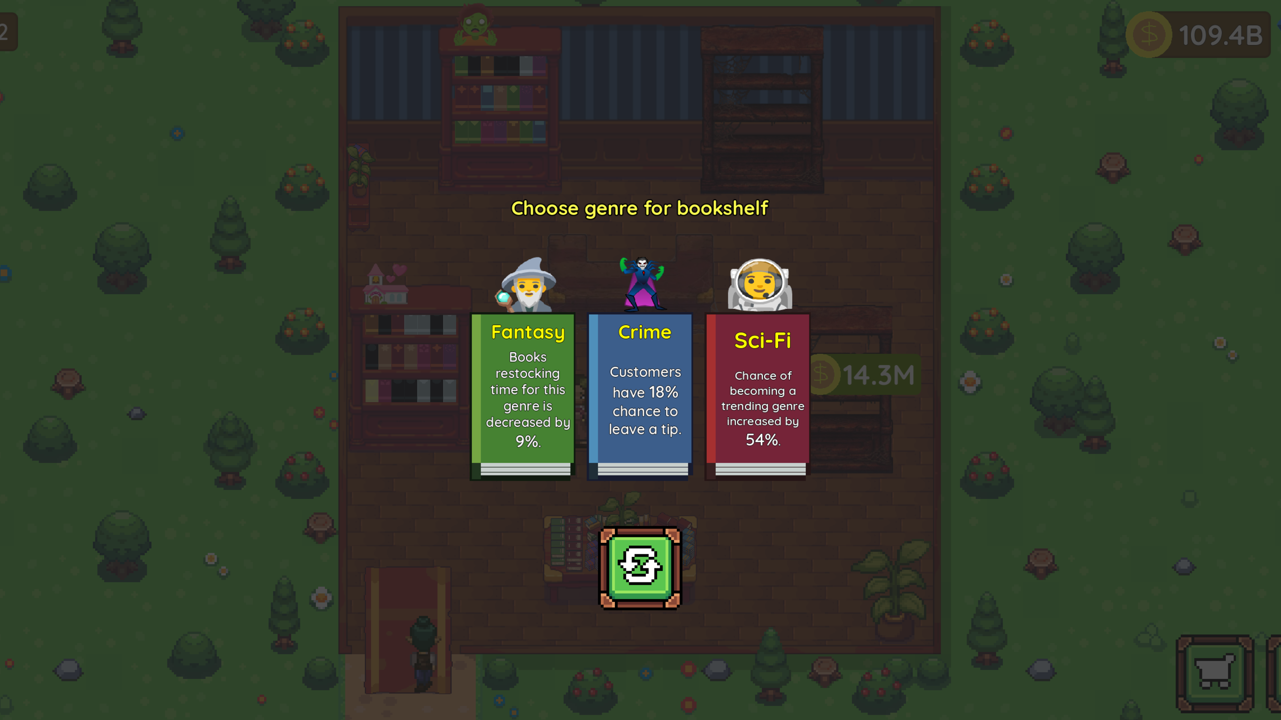 Nice game. Still a bit buggy, it crashes a lot when someone starts messing with the books (had to replay it again and it crashed again when someone messed with the books). Also as someone else said, the red dot for the upgrades get stuck. Numbers also don't make sense really, someone paying you 3 billion for a book and a bookshelf costing 3 billion... you just have to wait until it gives you enough money to buy upgrades or bookshelves and not really think about the money scale too much.